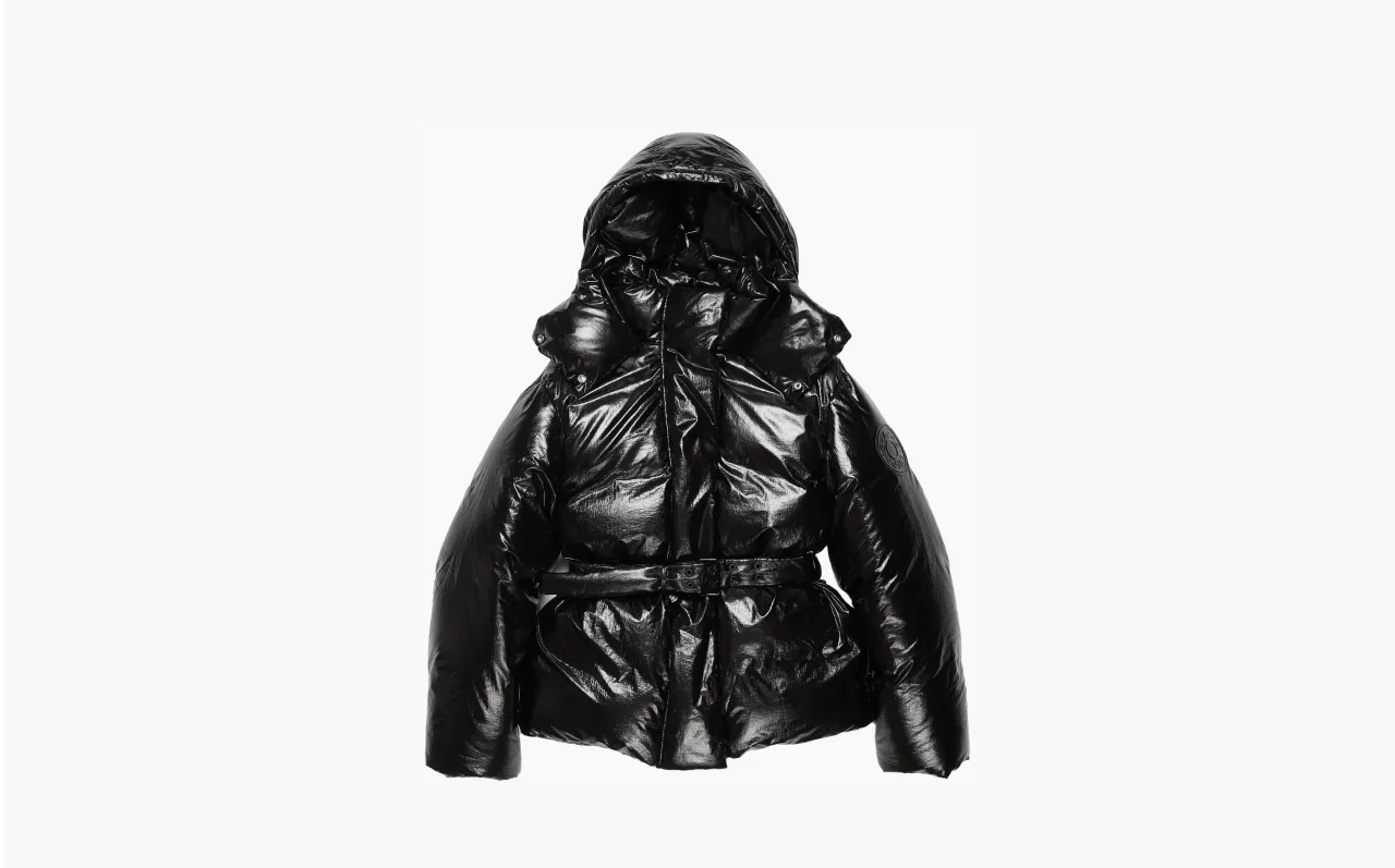 Черный матовый цвет подчеркивает чистоту линий и равномерную стеганую текстуру, придавая куртке сдержанную глубину. Главной особенностью является пояс, который позволяет подчеркнуть талию, добавляя силуэту структурированности и женственности. Это решение смягчает объемность пуховой куртки, сохраняя ее теплоизоляционные свойства.