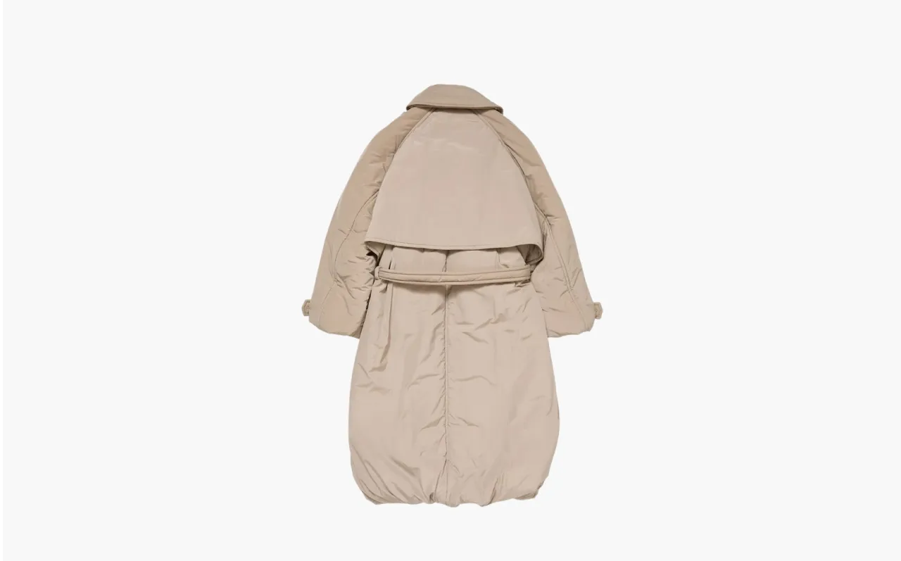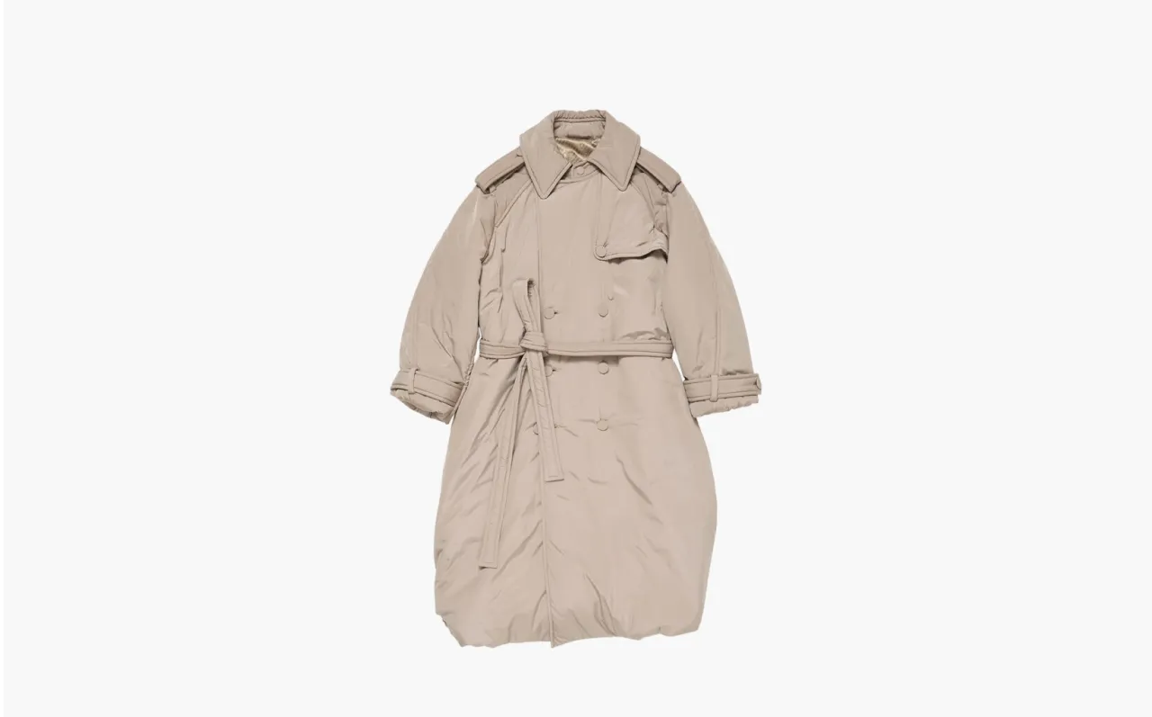 Характерные детали тренча — такие как погоны, двубортная застежка или пояс — могут быть переосмыслены в духе бренда: лаконично и без излишеств. Бежевый цвет сохраняет универсальность, легко комбинируясь с монохромными образами, денимом или деловым костюмом.
