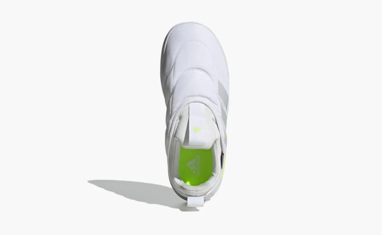 Кроссовки Adidas Adipuff — это модель в цветовом сочетании «white/lucid lemon» (белый и прозрачный лимонный), представляющая собой инновационный гибрид пуховика и обуви. Модель демонстрирует экспериментальный подход бренда к дизайну кроссовок.