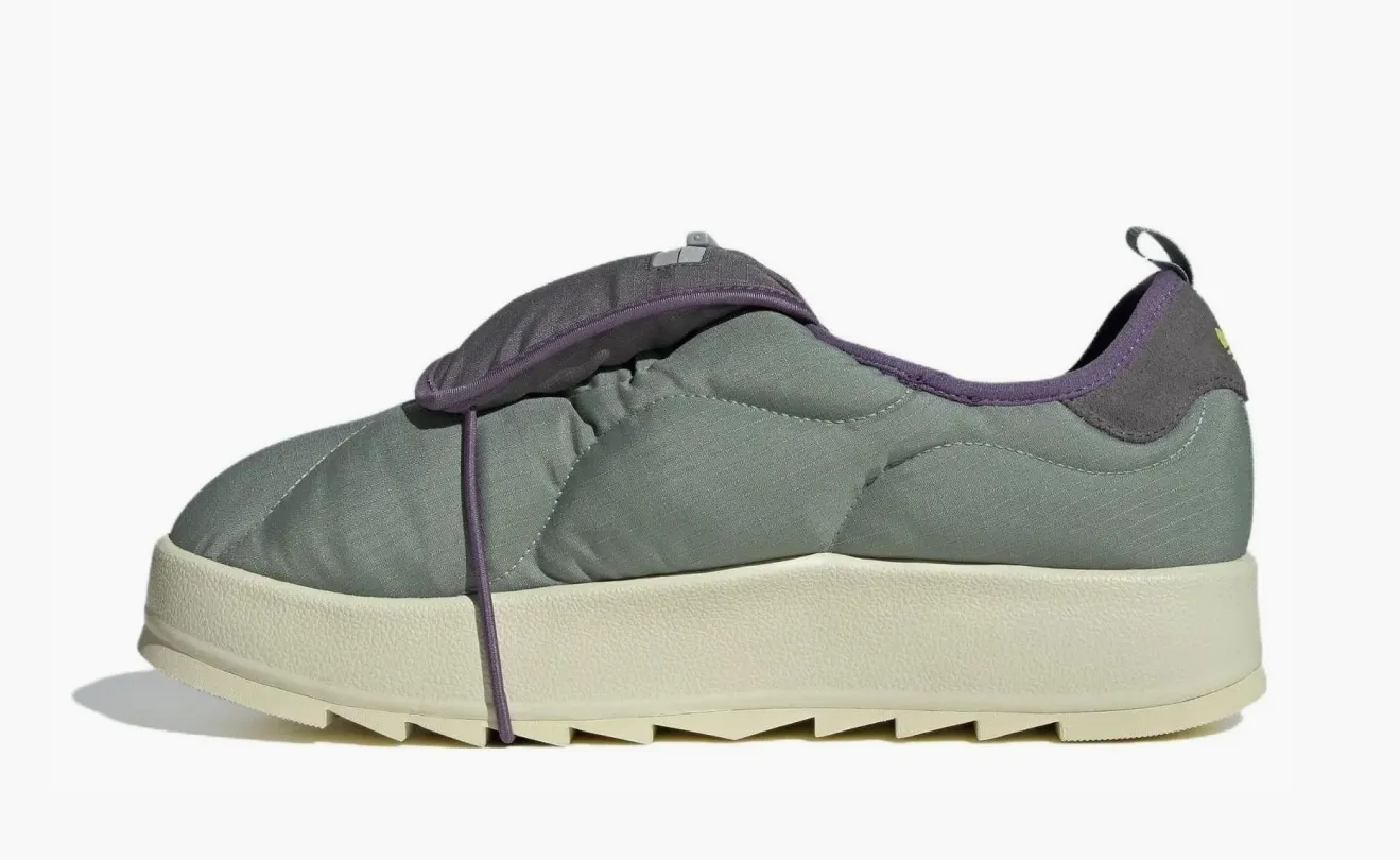 Кроссовки Adidas Puffylette — это модель в цветовом сочетании «silver/green» (серебристый/зелёный), представляющая собой футуристичную интерпретацию домашних тапочек в формате уличной обуви. Модель демонстрирует экспериментальный подход бренда к созданию гибридных силуэтов.