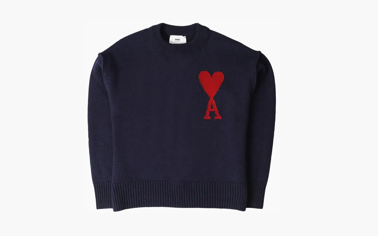 Свитер Ami Paris — синий, с красно-белой вышивкой Ami De Coeur. Унисекс-модель в насыщенном синем цвете, где фирменная эмблема в виде сердца контрастно выделяется на темном фоне.
