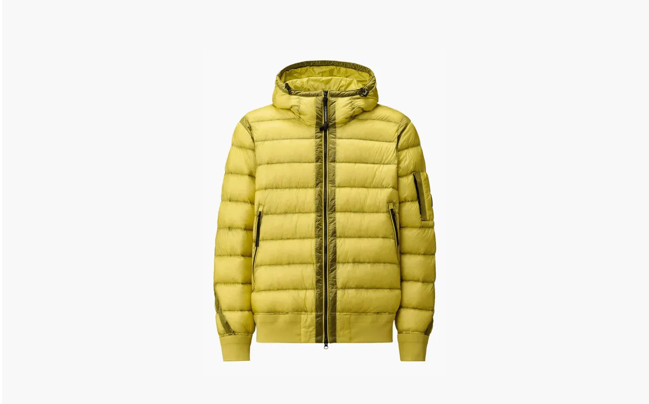 Куртка привлекает внимание насыщенным жёлтым цветом с равномерной стёжкой «в ромб» и интегрированными в капюшон съёмными гоглами — прозрачными линзами, обеспечивающими защиту от ветра и дождя. Прямой крой с эластичными манжетами и регулируемым подолом подчёркивает утилитарность, а усиленные швы в критичных зонах гарантируют долговечность.