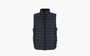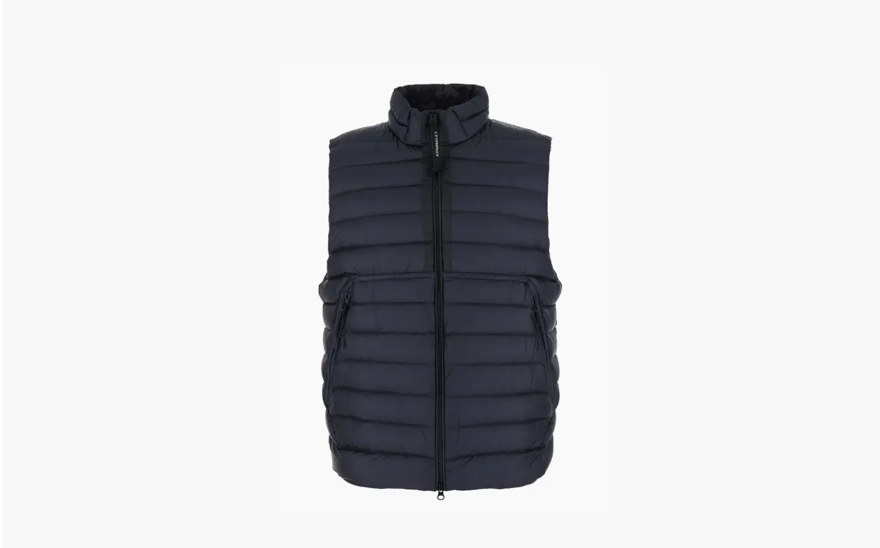 Жилет C.P. Company — это синяя модель с высоким воротником и логотипом, сочетающая технологичные материалы и функциональный дизайн. Вещь отражает наследие бренда в создании практичной экипировки для городских условий.