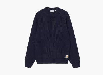 Carhartt WIP Firth Sweater в оттенке Dark Navy — это не просто свитер, а продуманная вещь на каждый день, которая сочетает в себе рабочую эстетику бренда и современный городской стиль.