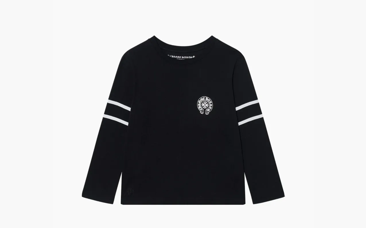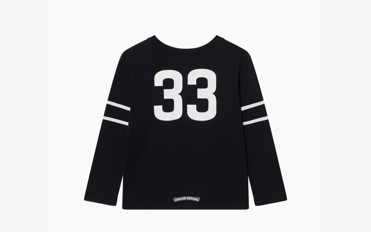 Лонгслив Chrome Hearts — черный, с длинным рукавом и лаконичным принтом: цифра 33 и подкова с надписью. Дизайн сдержанный, но за счет узнаваемой символики выглядит дорого и стильно.