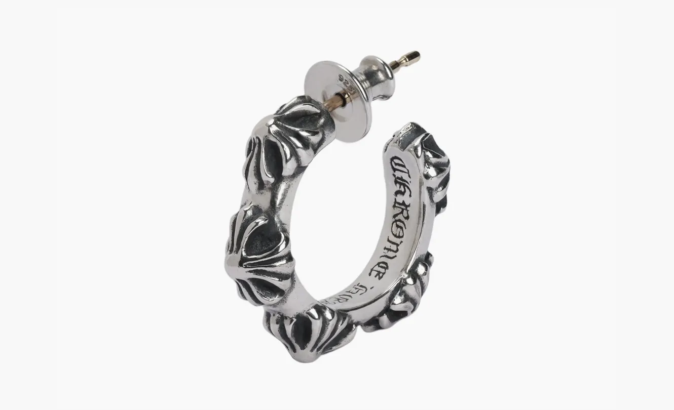 Серьги Chrome Hearts — серебряные, в виде обручей с подвеской в виде креста. Ювелирный дизайн, сочетающий классическую форму и фирменную готическую символику.