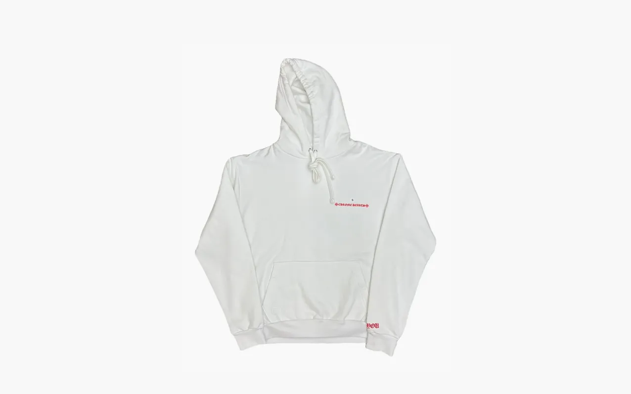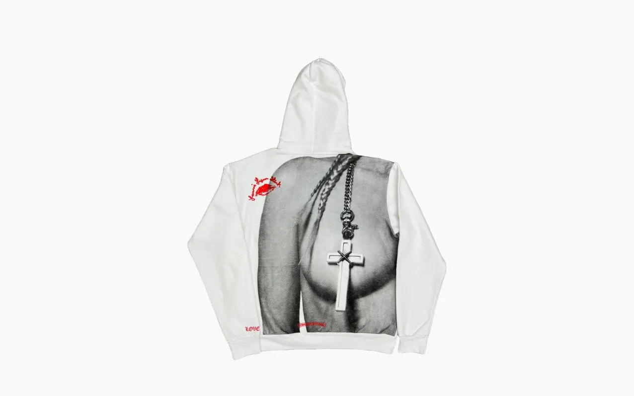 Худи Chrome Hearts — белое, с фотопринтом Laurie Lynn Stark и надписью «Love You». Дизайн сочетает личный архивный снимок и лаконичную типографику, создавая эмоциональный, но сдержанный образ.