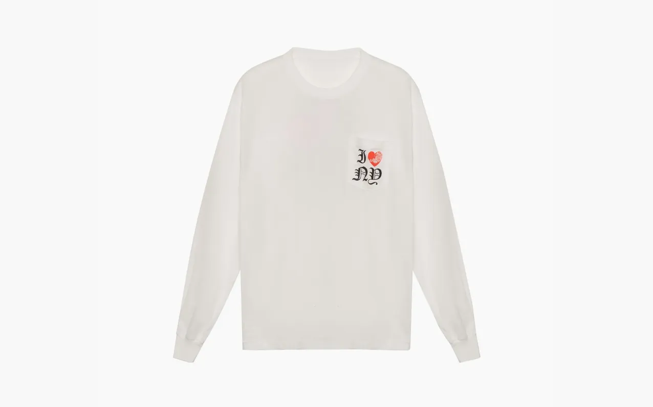 Лонгслив Chrome Hearts — белый, с принтом в виде стилизованного сердца и надписи I Heart NY. Дизайн отсылает к классической символике Нью-Йорка, переосмысленной через эстетику бренда.
