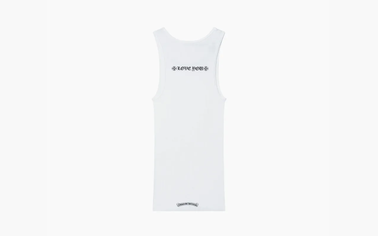 Топ Chrome Hearts — белый, с принтом «Love You». Дизайн сочетает чистый цвет и лаконичную типографику, создавая сдержанный, но эмоциональный акцент.