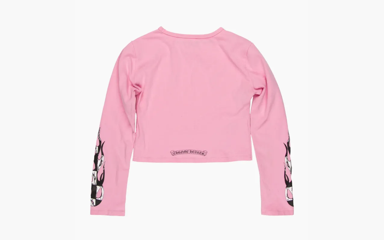 Топ Chrome Hearts — розовый, с укороченным кроем и принтом в виде пламени в стиле Matty Boy. Яркий цвет и графичный дизайн создают смелый, запоминающийся образ.