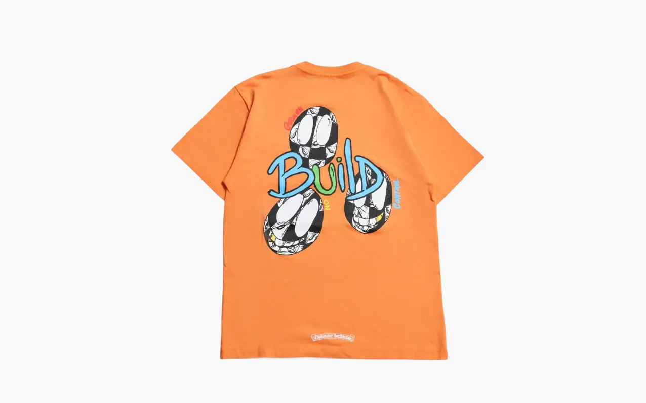 Футболка Chrome Hearts — оранжевая, с коротким рукавом и графичным принтом «Matty Boy Link Build». Яркий, почти неоновый цвет в сочетании с насыщенным черным рисунком создает дерзкий и современный образ.