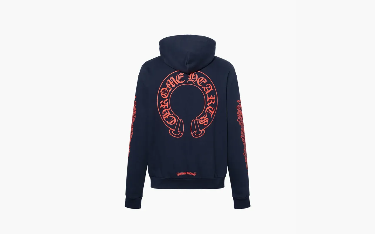 Худи Chrome Hearts — синее, с эксклюзивной вышитой подковой. Дизайн сочетает насыщенный морской оттенок и узнаваемую символику бренда, создавая сдержанный, но выразительный образ.