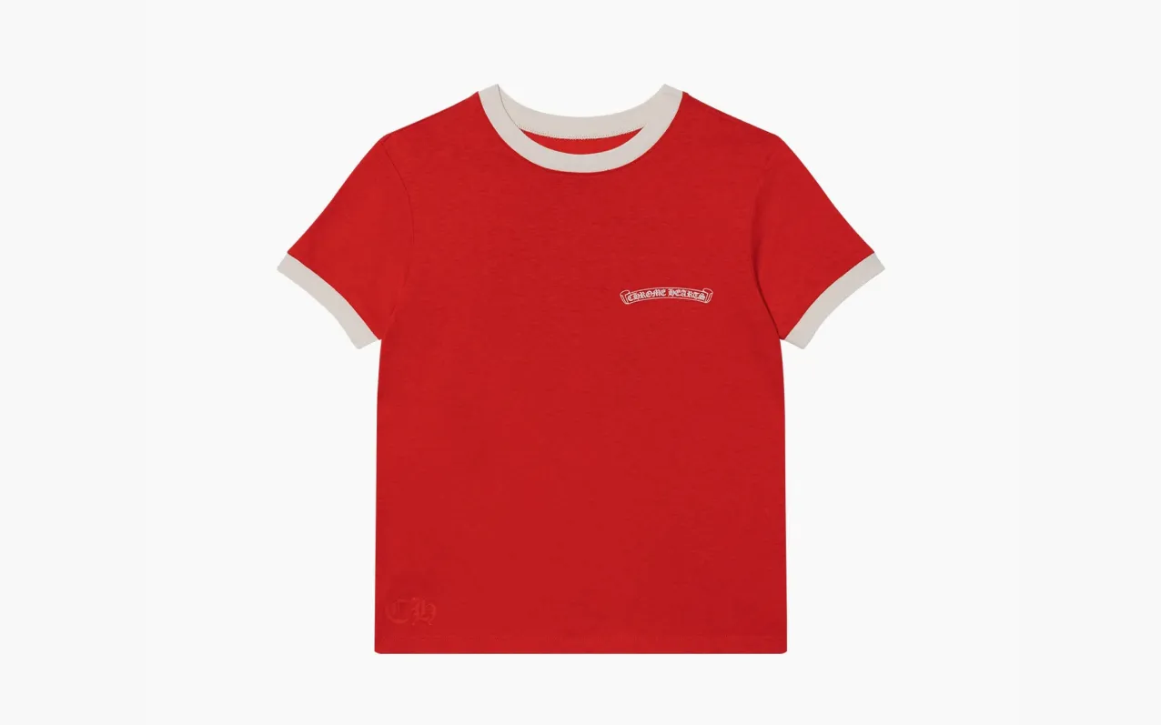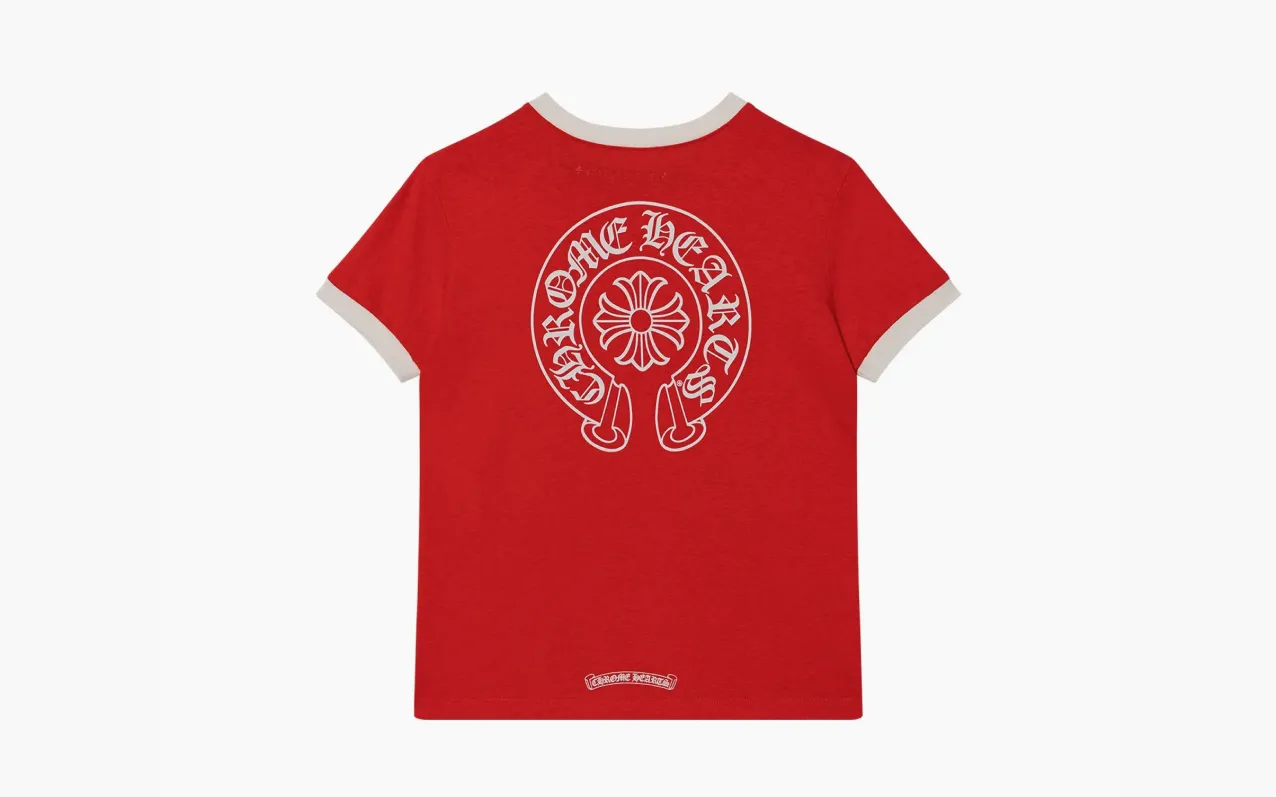 Футболка Chrome Hearts — красная, с принтом в виде роликовых коньков и подковы. Яркий цвет и винтажная тематика создают энергичный, запоминающийся образ.