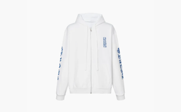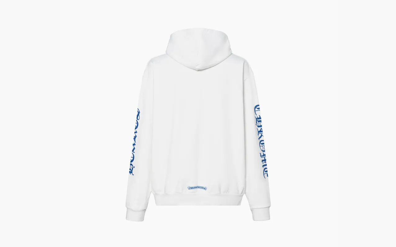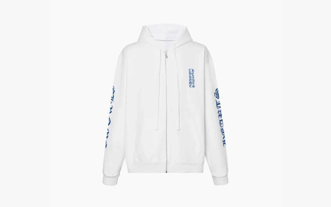 Худи Chrome Hearts — белое, на молнии, с ажурным принтом в виде свитка. Дизайн сочетает чистый цвет и сложную графику, характерную для бренда.