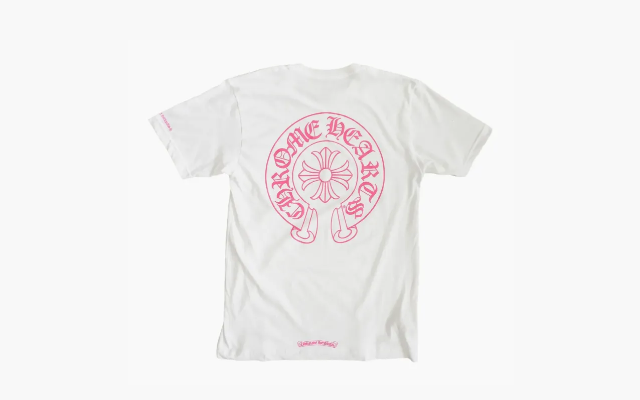 Футболка Chrome Hearts — белая, с коротким рукавом и необычной деталью: кожаной подковой с пряжкой на груди. Минималистичный дизайн, где акцент сделан на качество и фактуру, а не на яркий принт.