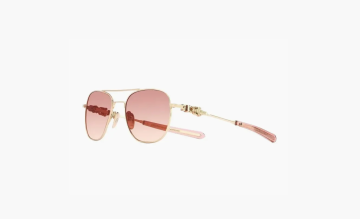 Очки Chrome Hearts — золотые с розовыми линзами. Модель сочетает теплый металлический оттенок оправы и нежный розовый градиент линз, создавая сложный, но гармоничный контраст.