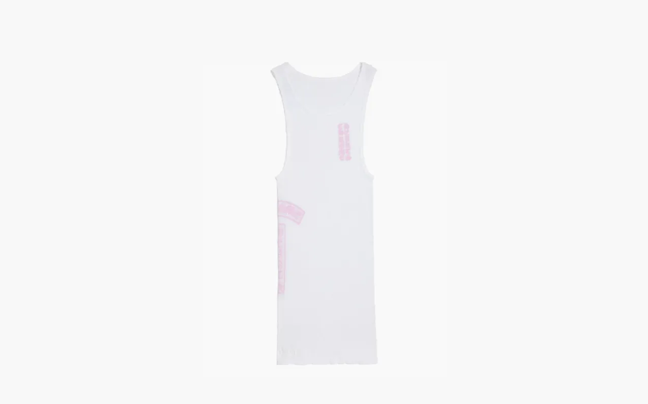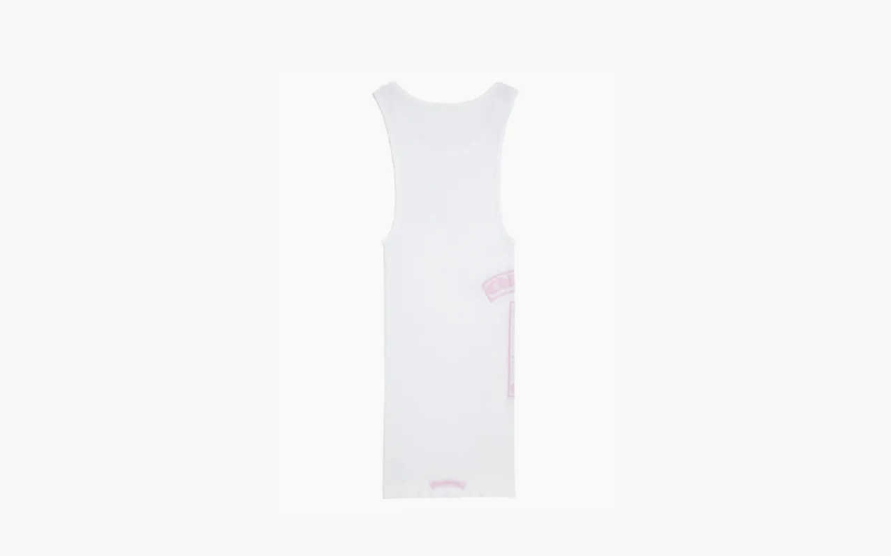 Майка Chrome Hearts — белая, с розовой окантовкой и рельефной резинкой. Лаконичный дизайн с акцентом на крое и фирменной символике на бретели.