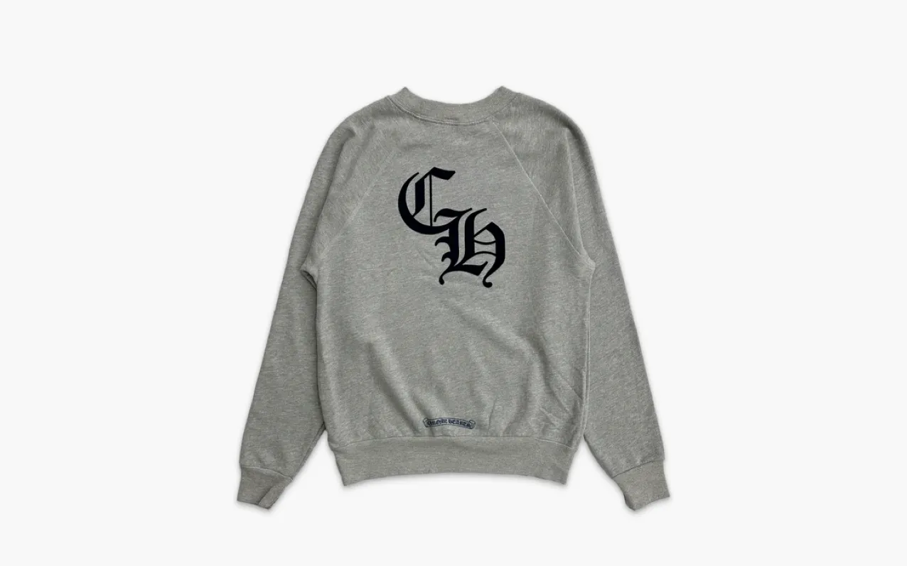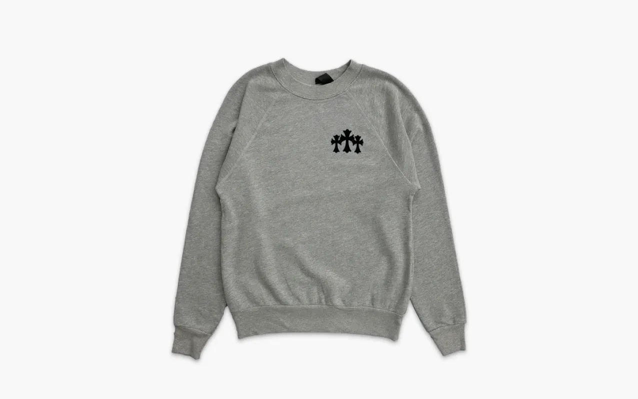 Свитшот Chrome Hearts серого цвета с вышитым тройным крестом на груди. Отличительная деталь — мягкий вельветовый материал, который сразу выделяет его среди обычных хлопковых моделей.