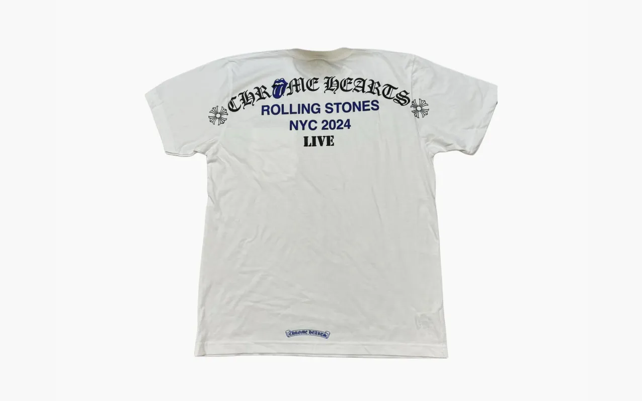 Футболка Chrome Hearts — белая, в коллаборации с Rolling Stones. Дизайн объединяет культовую символику группы и минималистичный подход бренда, создавая сдержанный, но мощный визуальный акцент.