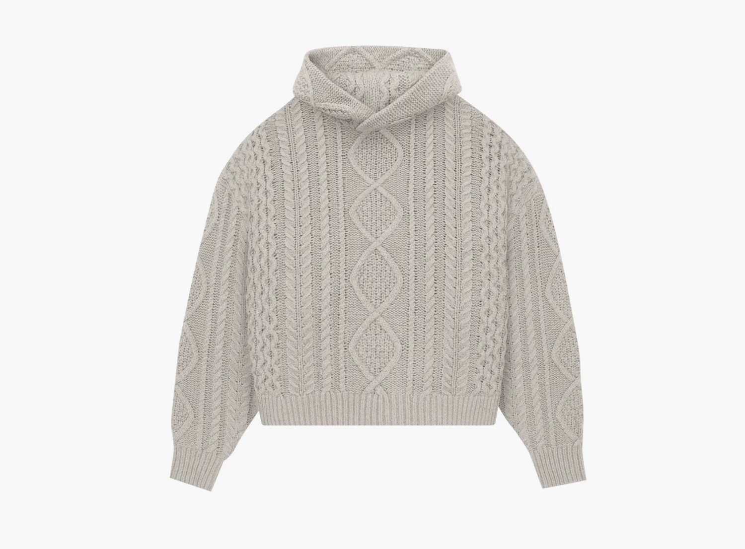 Fear of God Essentials Cable Knit Hoodie в оттенке Silver Cloud (серый) — это не просто худи, а продуманная интерпретация классического трикотажа в современном ключе.