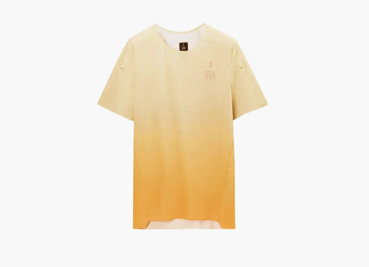 Loewe × On Running Performance Tee в градиентном оранжевом исполнении — это не просто футболка, а совместный проект двух знаковых брендов: испанского дома моды Loewe и швейцарского производителя спортивной экипировки On Running.