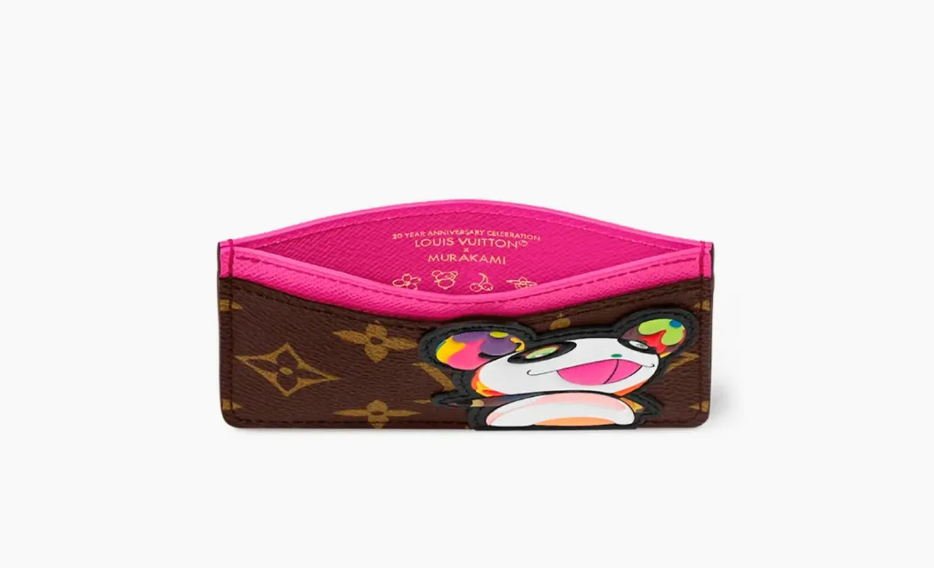 Портмоне привлекает внимание узнаваемым принтом Monogram, дополненным милыми пандами работы Мураками — они изображены в фирменном стиле художника, с наивными глазами и цветочными элементами. Классический формат с несколькими отделениями для карт и прозрачным окошком для удостоверения сохраняет практичность, а контрастная жёлтая внутренняя отделка добавляет яркий акцент.