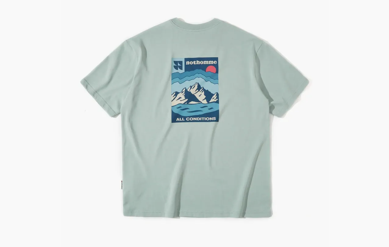 Футболка Nothomme Mountain Peak Water Land Air Print T-Shirt в цвете Mint Blue — это графическая модель, вдохновлённая эстетикой outdoor-приключений. Её главная особенность — крупный художественный принт с изображением горных вершин, водных пространств и неба, что создаёт ощущение свободы и связи с природой.