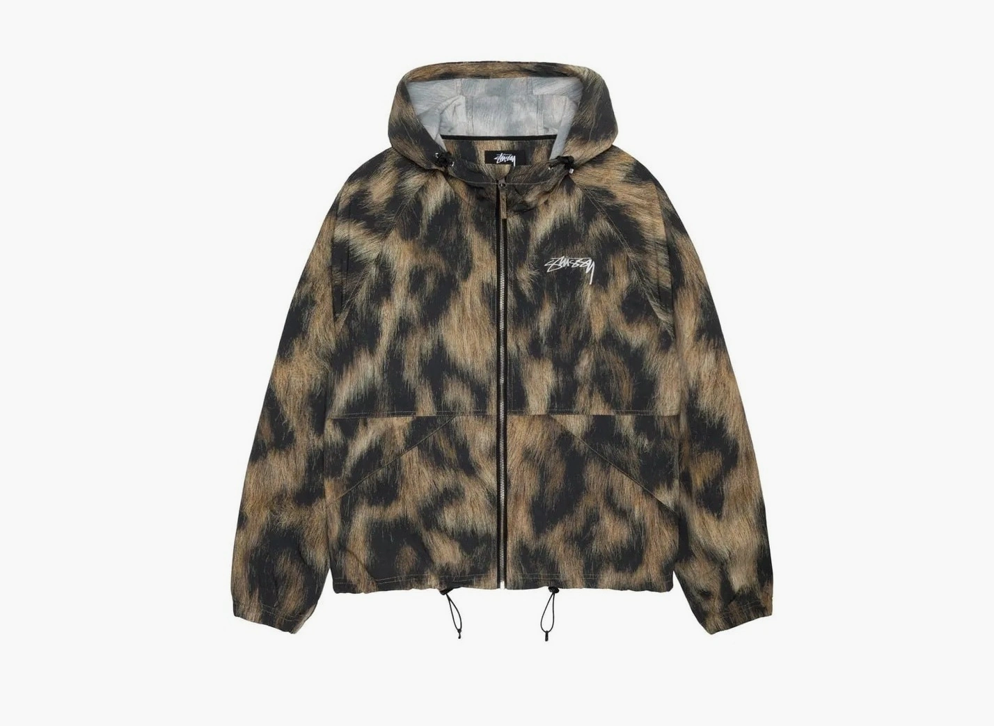 Куртка Stussy Beach Shell Fur Print Jacket в теплом коричневом цвете. Модель сразу обращает на себя внимание смелым графическим принтом, который точно имитирует текстуру звериного меха.