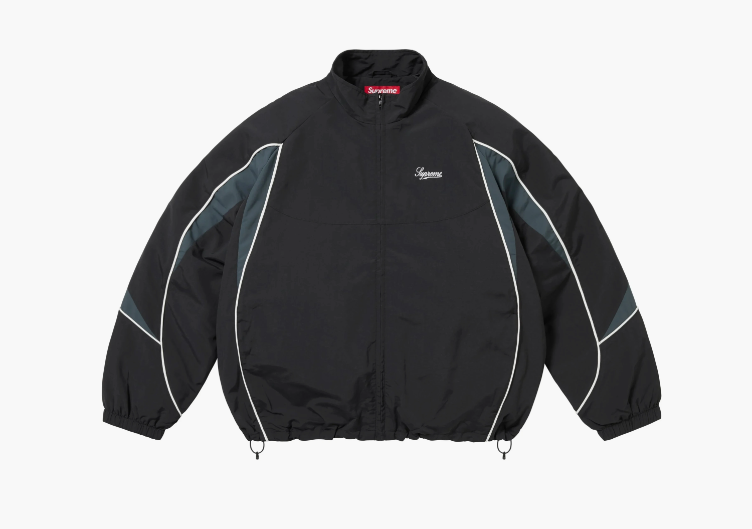 Supreme Contrast Piping Track Jacket в чёрном цвете — куртка, которая доказывает: лаконичность может быть выразительной. С первого взгляда — классический чёрный силуэт, но детали выдают фирменный стиль Supreme. Контрастная окантовка по швам не нарушает чистоту линий, а деликатно подчёркивает крой. Чёрный здесь — не просто фон, а насыщенный, глубокий оттенок, который легко сочетается с любой одеждой: от строгих брюк до спортивных штанов.