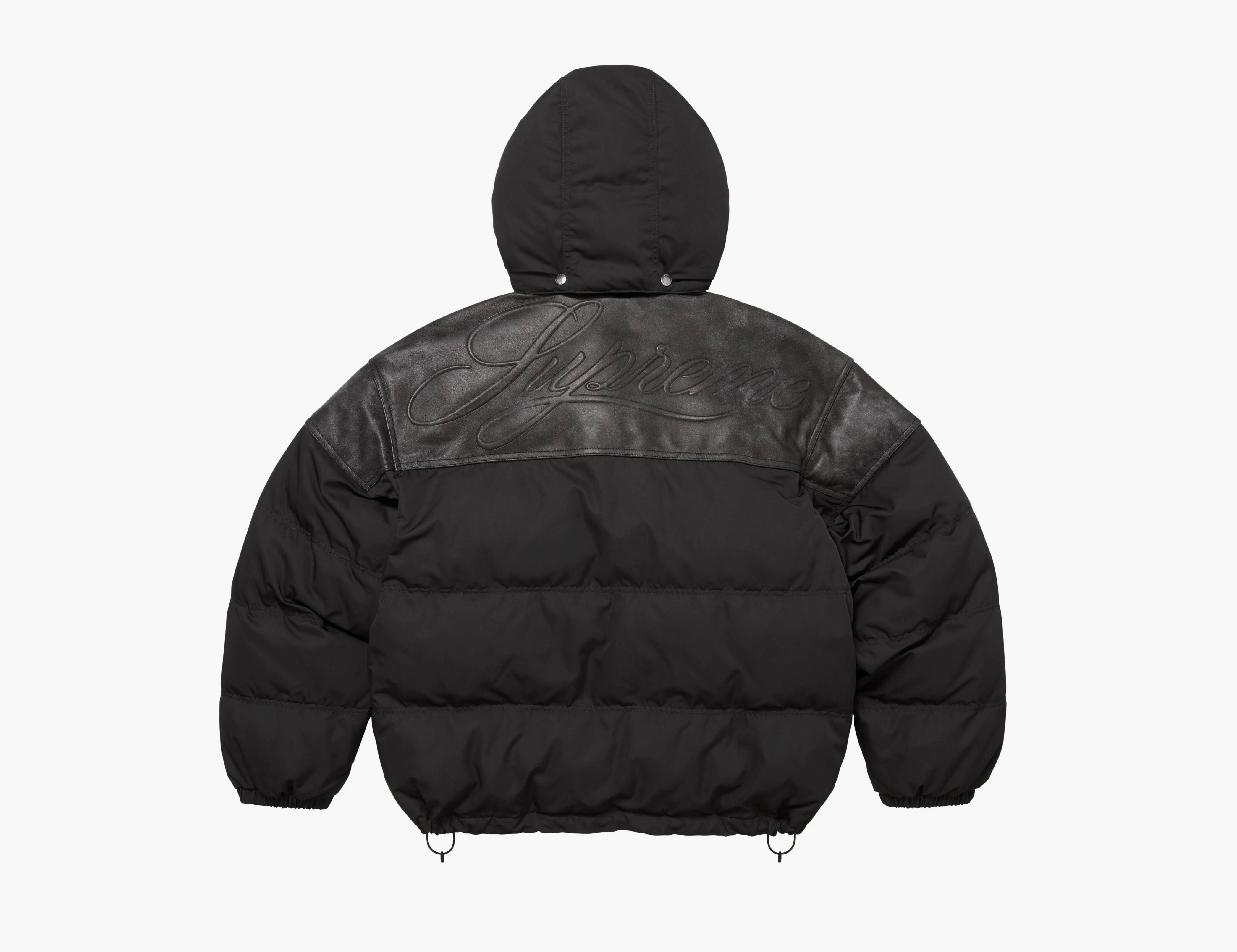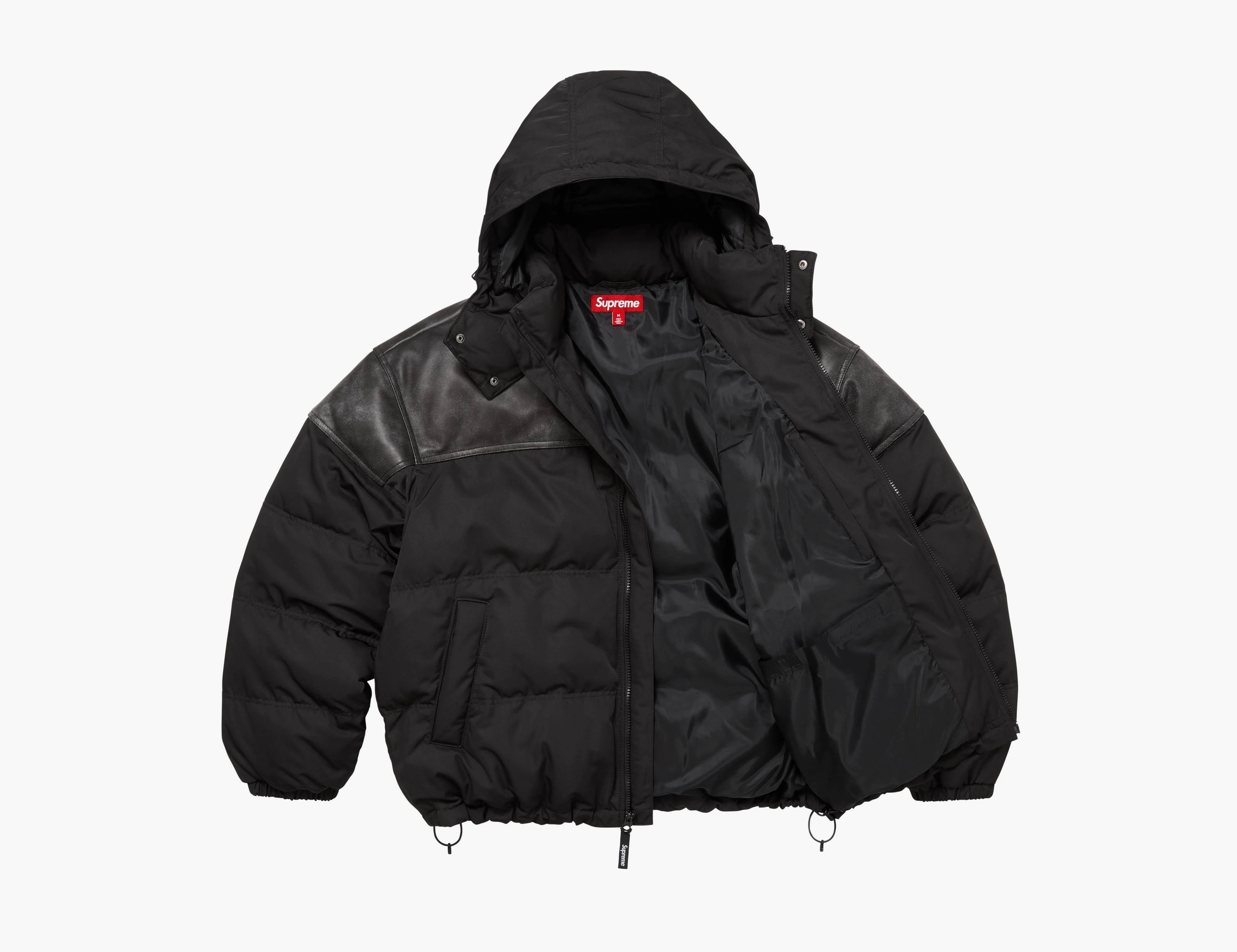 Supreme Leather Yoke Puffer Jacket в чёрном цвете — это куртка, которая сразу заявляет о себе без лишнего шума. Строгий чёрный, чёткие линии и фирменный кожаный «yoke» (перемычка) на плечах — здесь всё по делу.