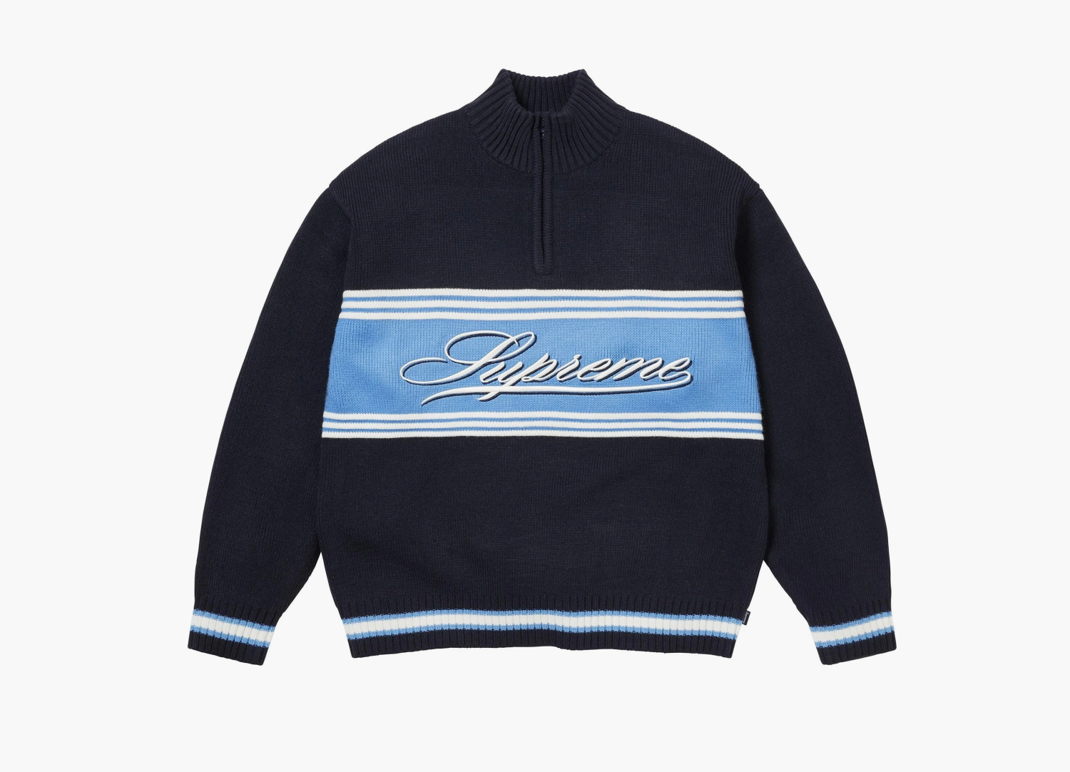 Supreme Script Stripe Half Zip Sweater в тёмно‑синем цвете — это свитер, который ловко балансирует между повседневностью и фирменным стилем бренда.