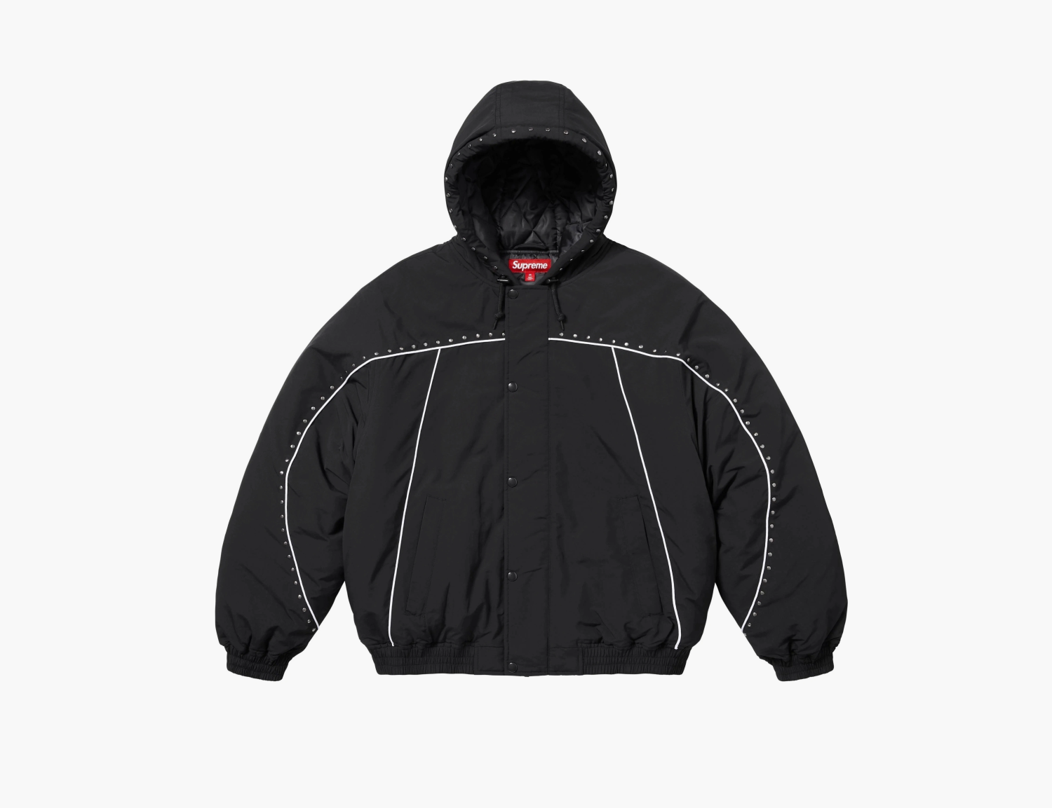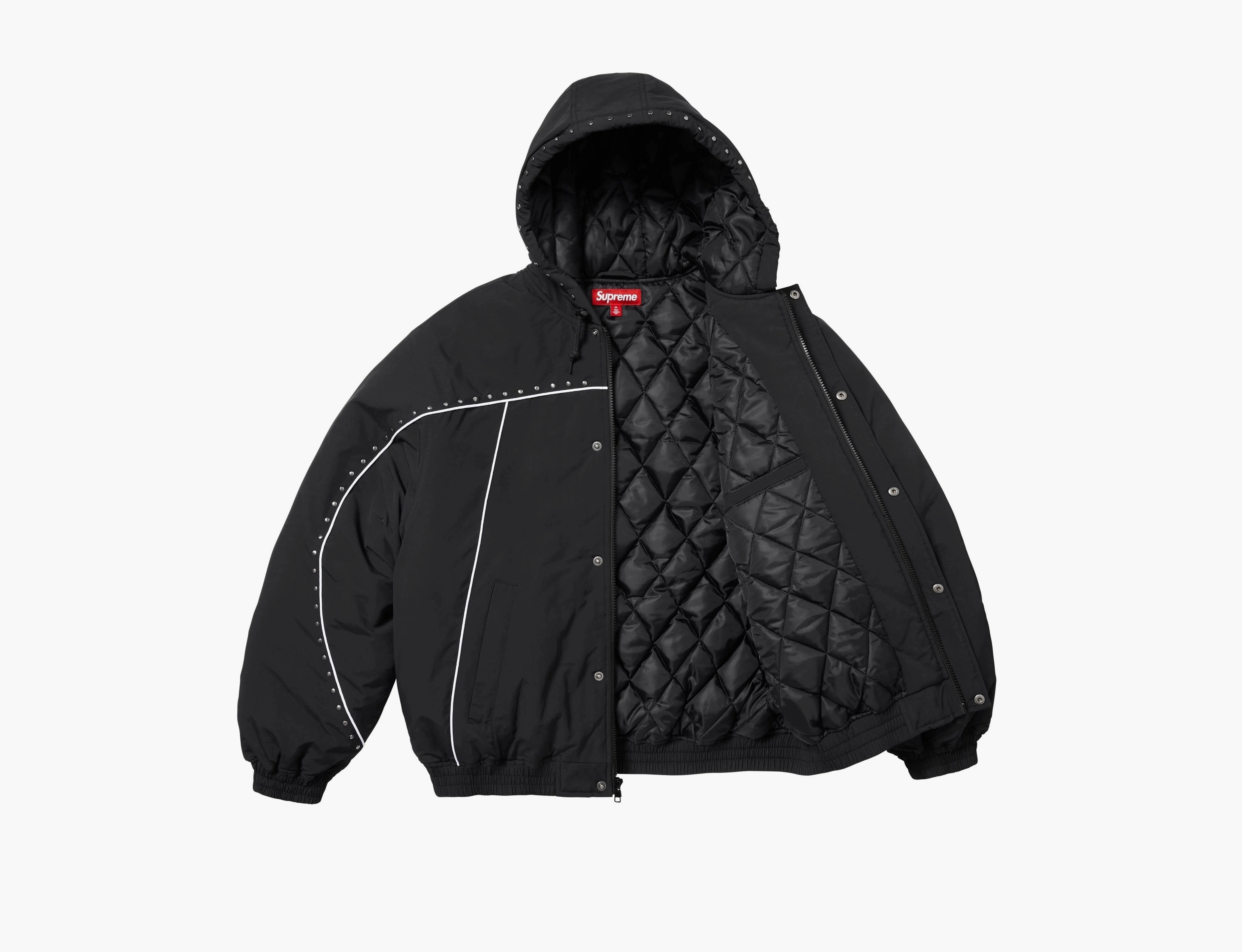 Supreme Studded Stadium Jacket в классическом чёрном цвете — это культовая куртка, которая давно стала символом уличной моды. Модель выделяется характерным дизайном с металлическими заклёпками, которые добавляют брутальности и делают образ более выразительным.