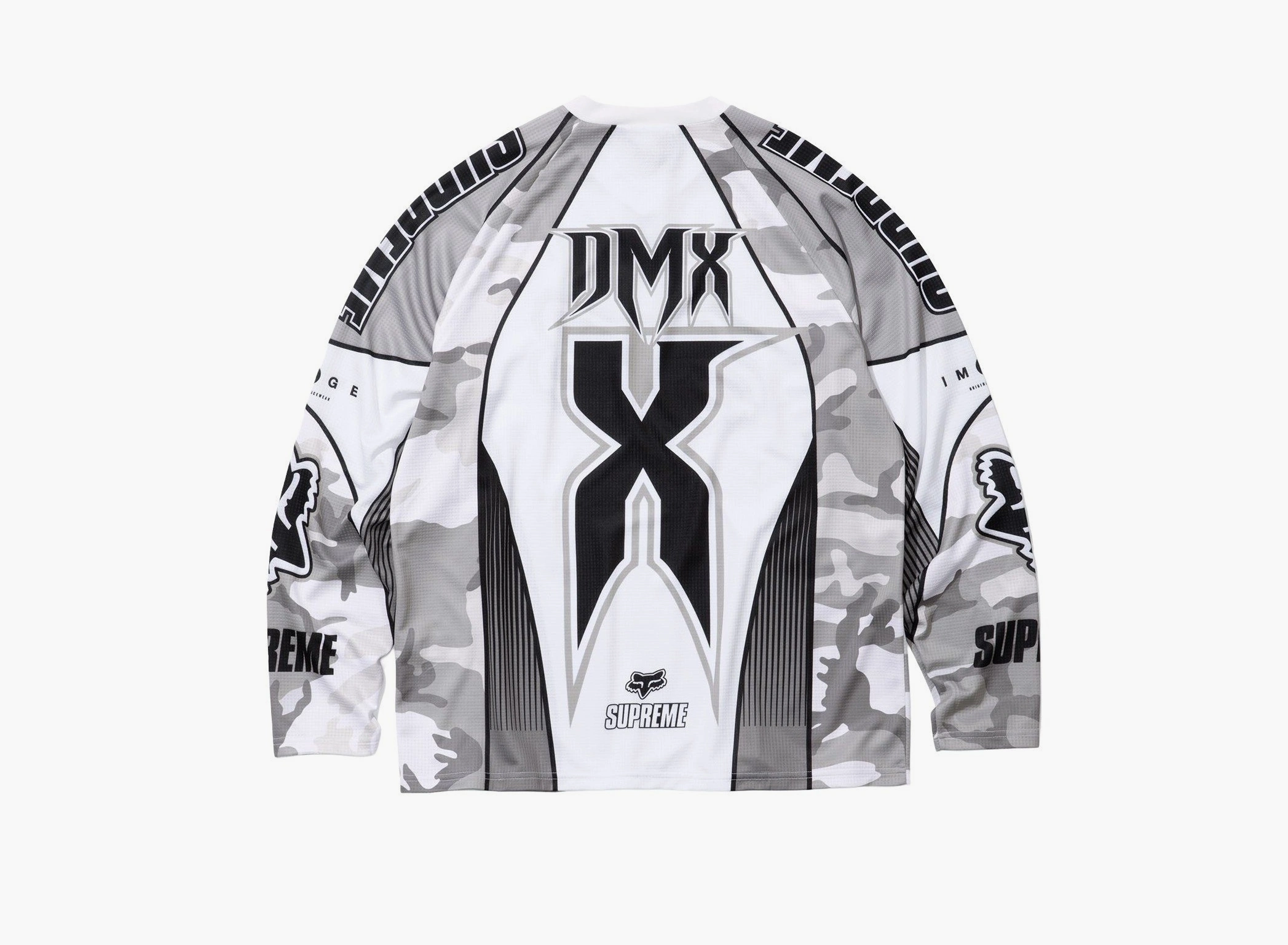 Supreme × Fox Racing DMX Long‑Sleeve Snow Camo в белом цвете — совместная работа двух знаковых брендов, объединившая уличную эстетику и спортивную функциональность.