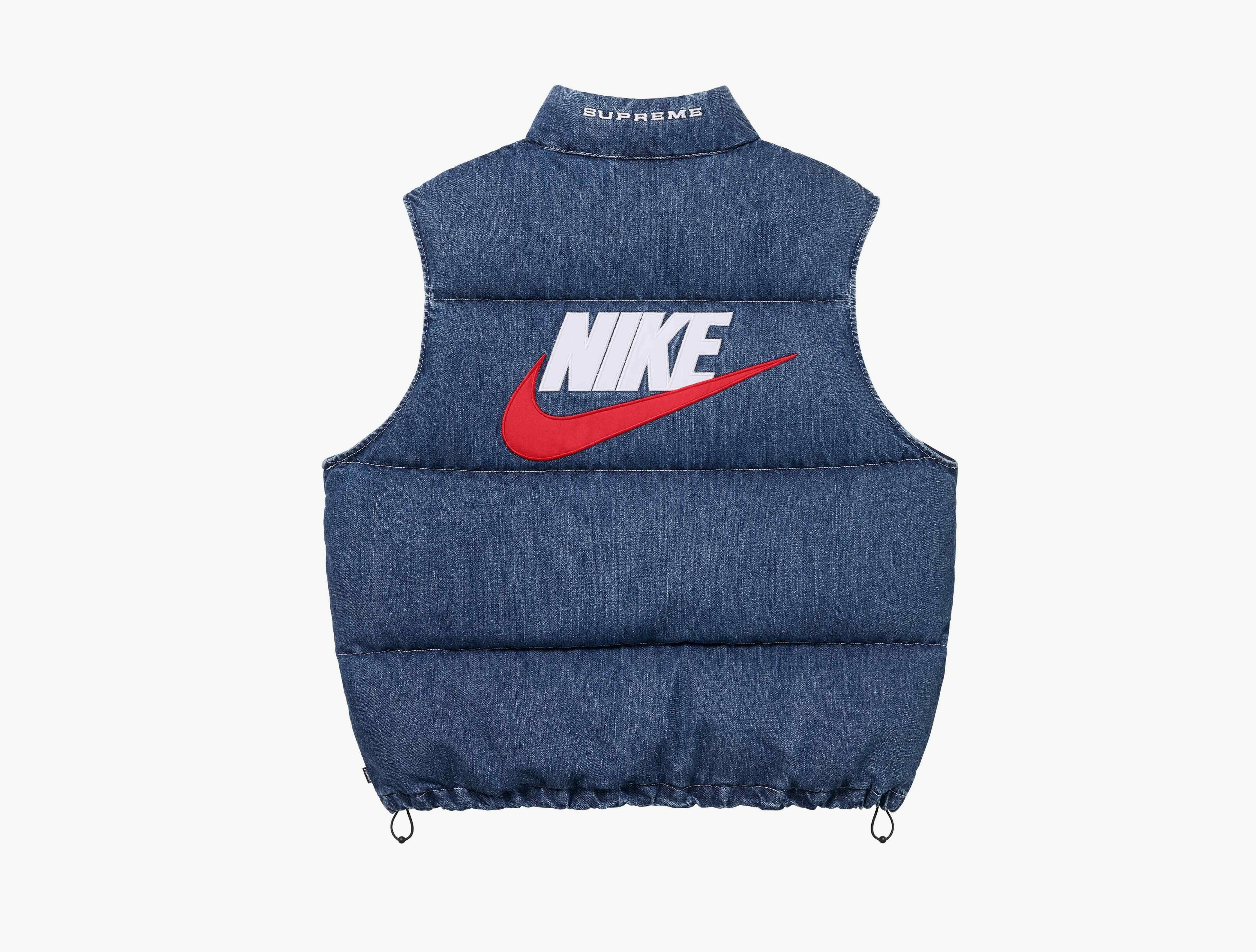 Supreme x Nike Denim Puffer Vest Indigo — это настоящая находка для тех, кто ценит необычные решения в одежде. Синяя джинсовая жилетка с утеплителем — результат коллаборации двух культовых брендов, который точно не оставит равнодушным.