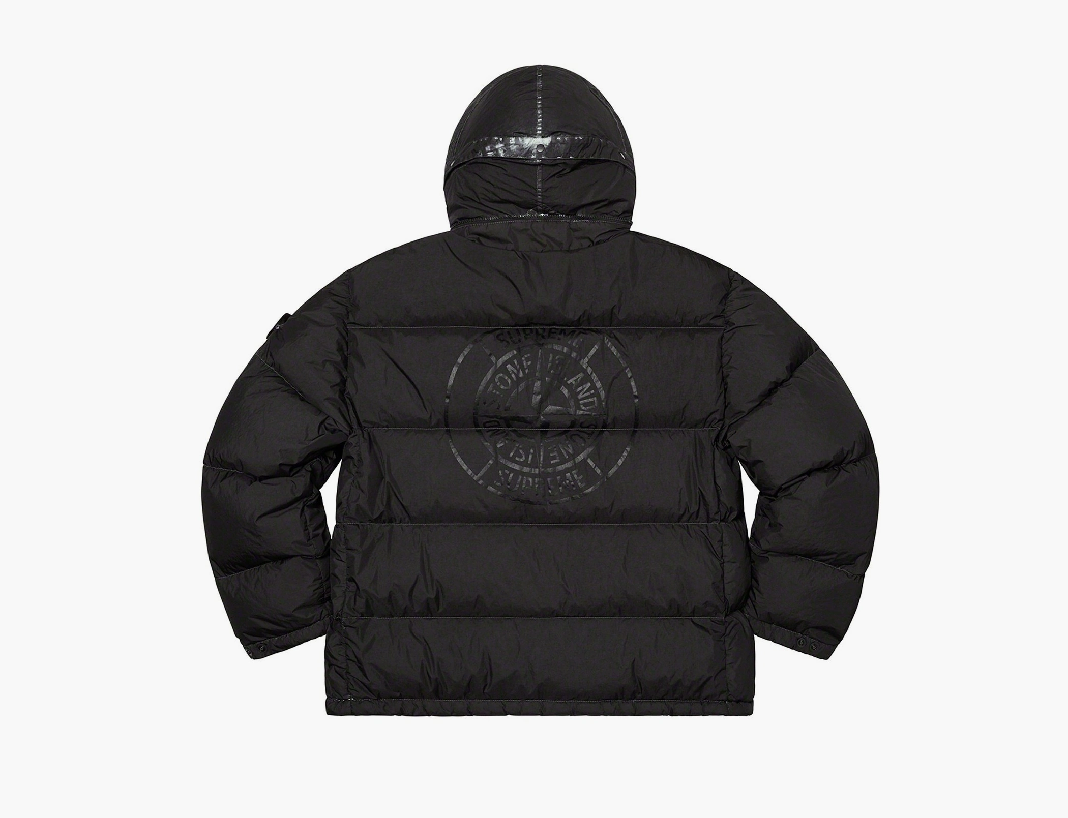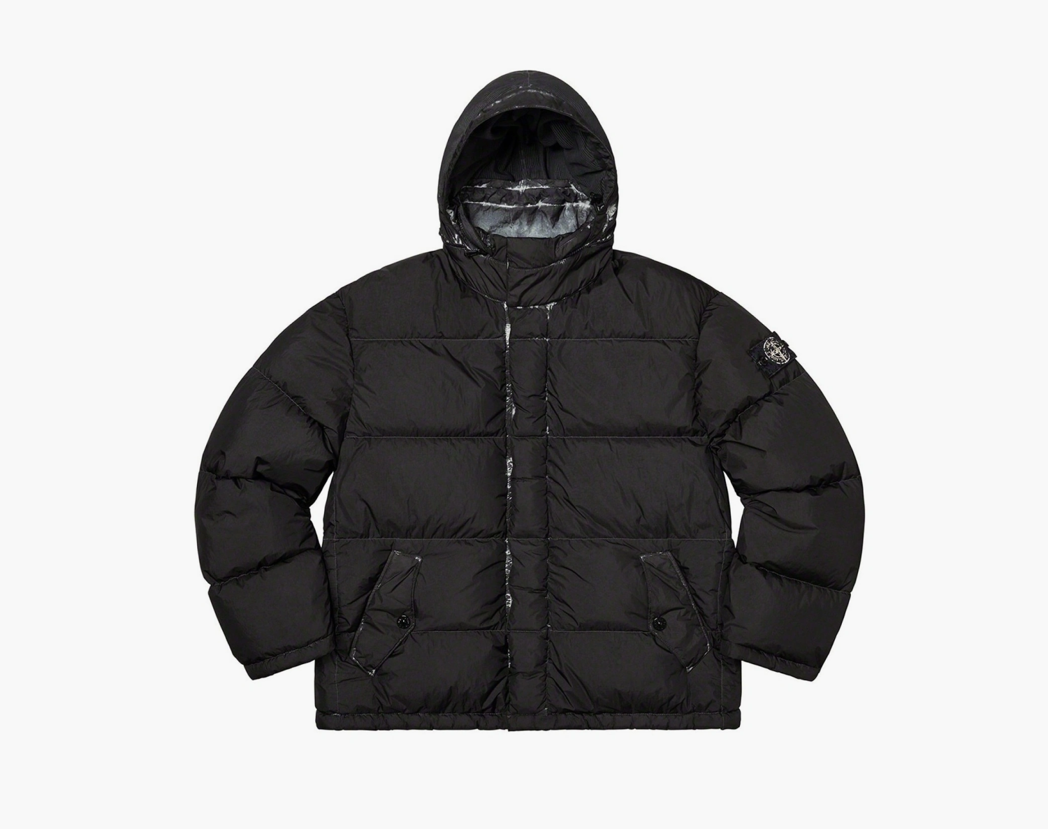 Supreme x Stone Island Painted Camo Crinkle Down Jacket в чёрном цвете — это не просто куртка, а совместный релиз двух культовых брендов, где встретились уличная эстетика Supreme и технологичный подход Stone Island.