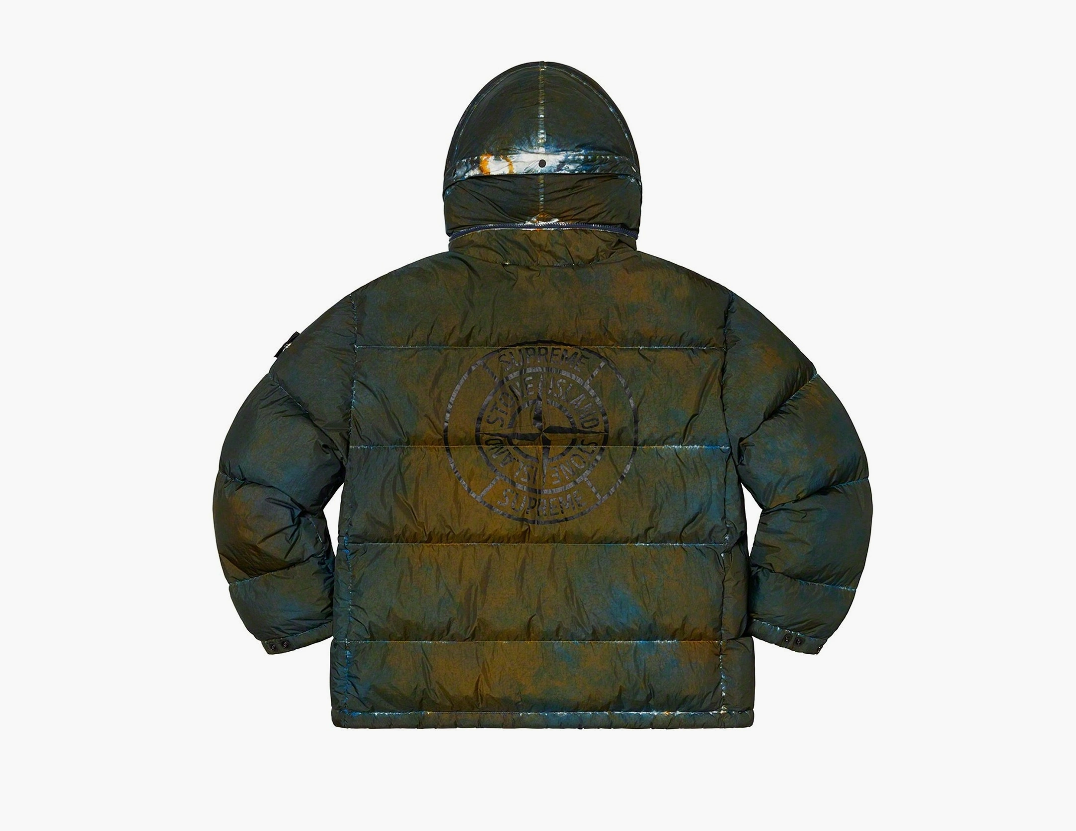 Supreme x Stone Island Painted Camo Crinkle Down Jacket в тёмно-бирюзовом оттенке (Dark Teal) — это то, что точно стоит иметь в своём гардеробе, если вы следите за уличной модой. Куртка получилась на стыке двух культовых брендов, и это чувствуется в каждой детали.