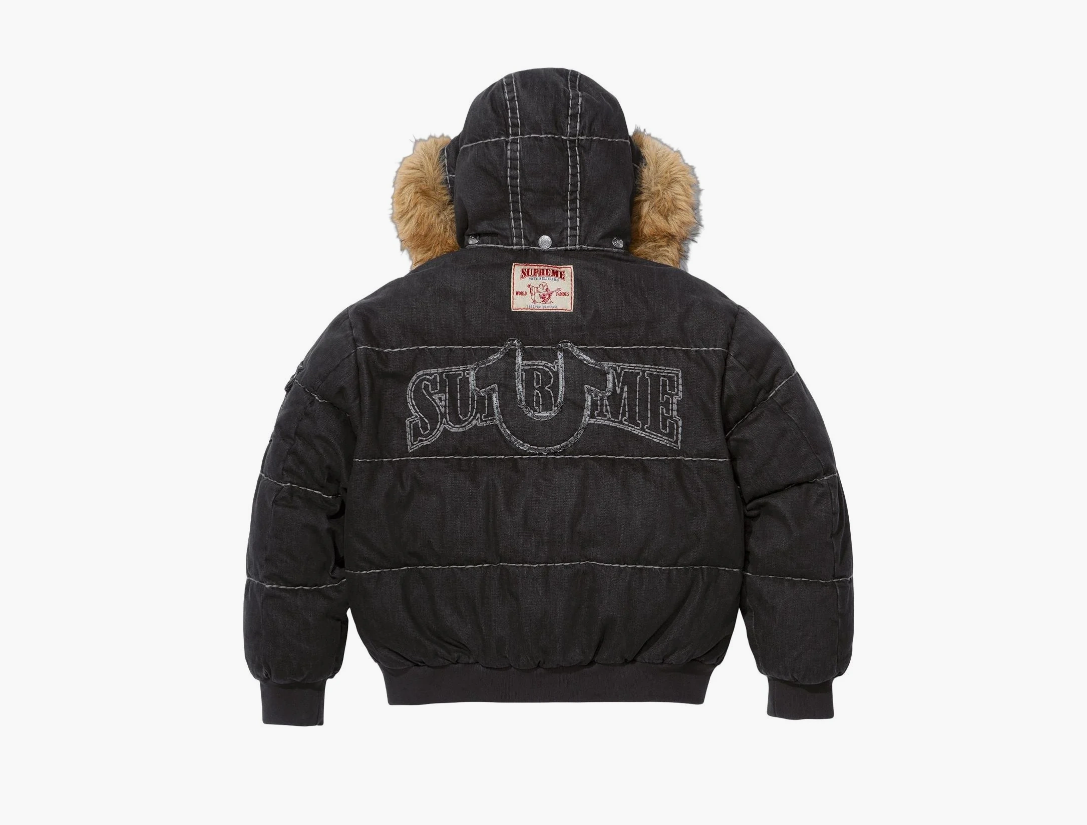 Supreme × True Religion Puffer Jacket в чёрном цвете — это не просто пуховик, а яркий пример удачного коллаба двух знаковых брендов уличной моды.