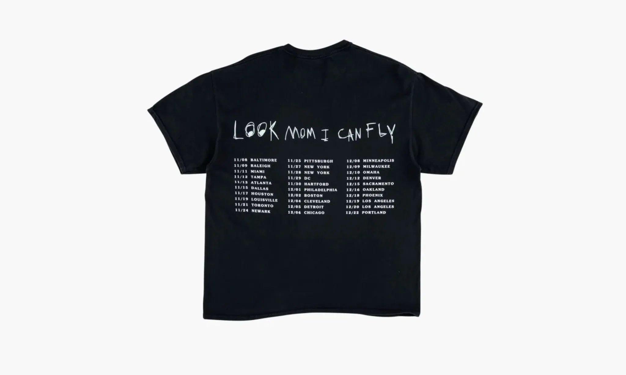 Футболка выполнена из высококачественного хлопка, обеспечивая мягкость и комфорт при носке. Ее стильный дизайн включает в себя графический принт с надписью "Look Mom I Can Fly" на груди, что является отсылкой к одноименному документальному фильму о жизни и творчестве Travis Scott.
