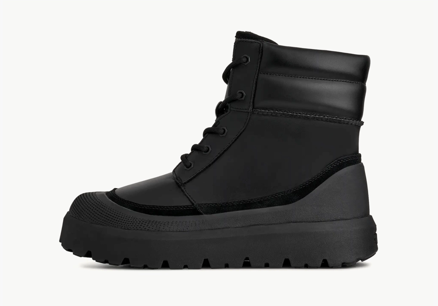 UGG Neumel High Weather Hybrid Triple Black в классическом чёрном цвете. Эти ботинки созданы для тех, кто ищет надежную и стильную обувь для холодной погоды, не жертвуя комфортом и практичностью. Модель отличается лаконичным, чуть гранжевым дизайном: высокая форма, прочный верх из водоотталкивающей кожи и удобная шнуровка. Внутри — натуральный овчинный мех, который отлично сохраняет тепло и регулирует влажность, а современная подошва с рифлением гарантирует хорошее сцепление даже на скользких поверхностях. Технологии и материалы построены так, чтобы делать обувь максимально долговечной и устойчивой к влаге. Это особенно важно в непогоду — ботинки не пропускают воду, сохраняя ноги сухими, а крепкая подошва выдержит постоянное использование, не растеряв внешний вид. Эта модель сочетает в себе современную функциональность и исконный стиль UGG, который уже много лет держится в тренде. Надежность, проверенная временем, сделана из качественных материалов и отлично подходит для ежедневных городских рейдов зимой или межсезоньем.