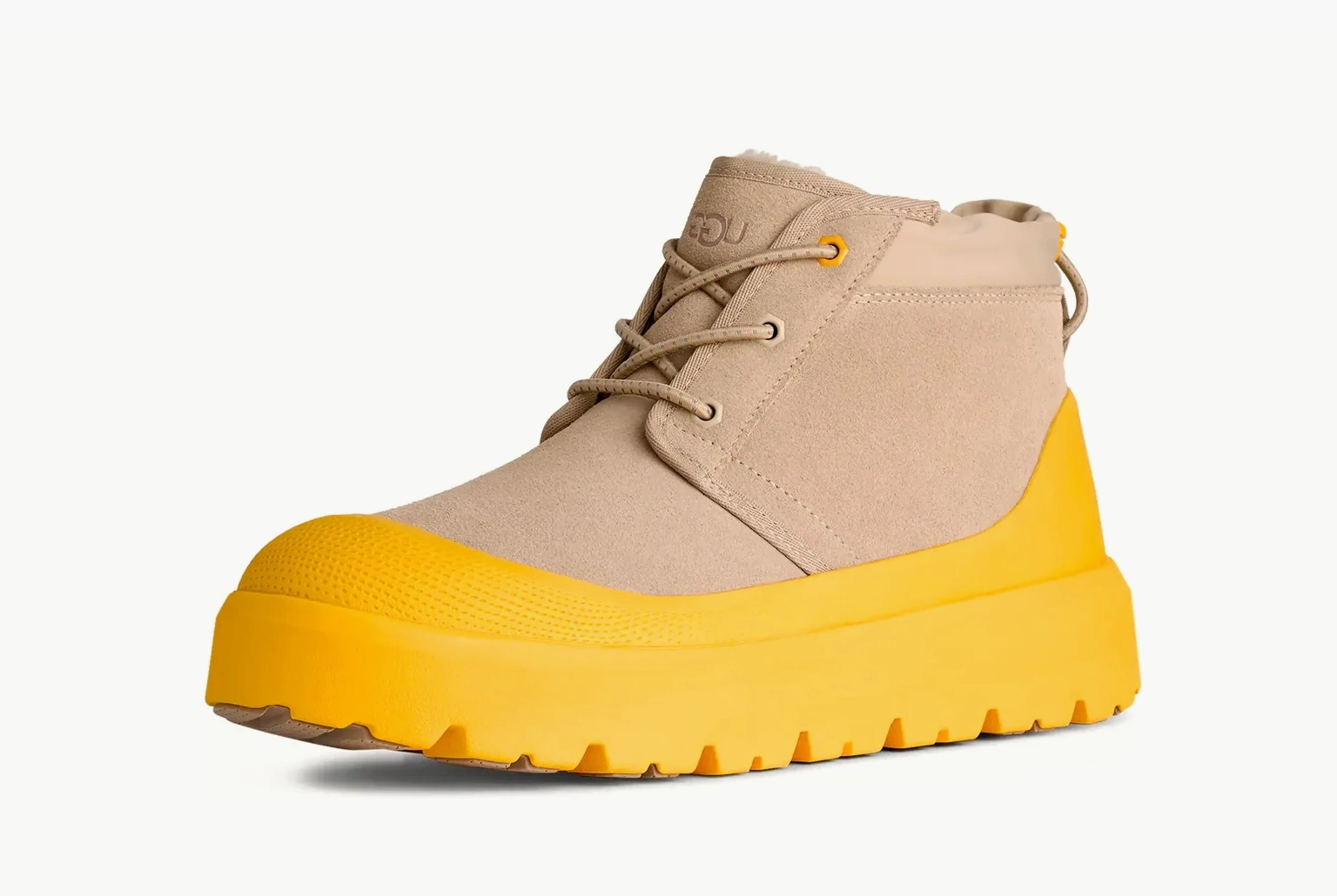 UGG Neumel Weather Hybrid Mustard Seed Summer Wheat в классическом бежевом цвете. Эта модель сочетает в себе узнаваемый уют и современные технологии, создавая универсальный обувной вариант для теплых месяцев. Конструкция обуви построена на основе прочных, водоотталкивающих замшевых материалов, дополненных вставками из технических мембранных тканей. Такой дуэт обеспечивает защиту от влаги и ветра, сохраняя ногу сухой и комфортной. Внутри использован дышащий утеплитель, который хорошо регулирует температуру — босоножки не перегреваются, оставаясь комфортными даже в жаркую погоду. Гибкая резиновая подошва с протектором гарантирует хорошее сцепление на различных поверхностях, что делает их подходящими для прогулок и городской жизни. Эта модель — отличное решение для тех, кто ищет легкую, практичную и в то же время стильную обувь. Удобство и современные материалы позволяют чувствовать себя уверенно в течение всего дня. Классический дизайн отлично гармонирует с повседневным гардеробом, а благодаря сбалансированному сочетанию стиля и технологий, эти ботинки отлично справляются с капризами погоды и городской суетой.