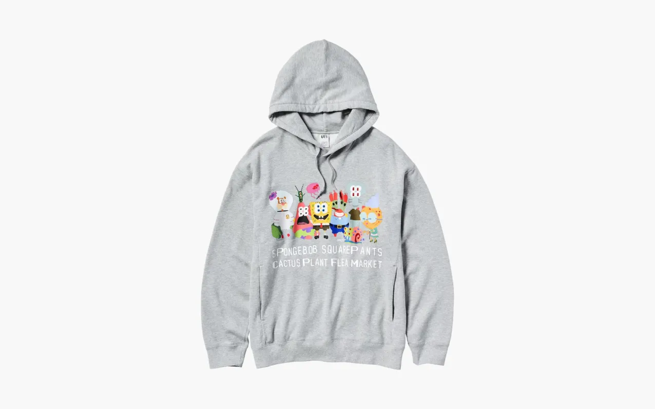 Худи Uniqlo x CPFM Spongebob Squarepants — серое. Это результат коллаборации бренда масс-маркета Uniqlo, лейбла Cactus Plant Flea Market (CPFM) и культового мультсериала «Губка Боб Квадратные Штаны».